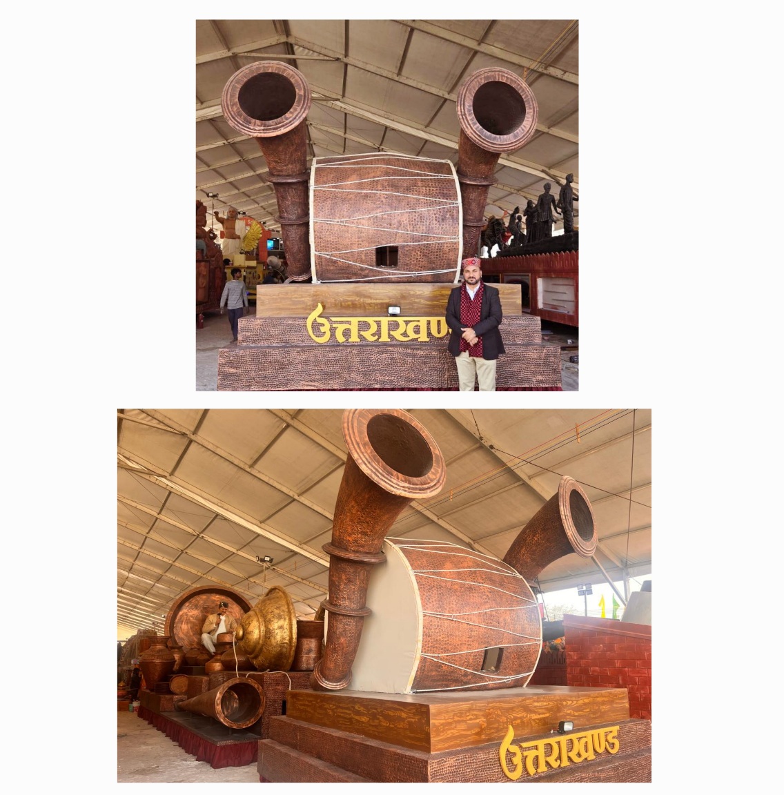सूचना विभाग के संयुक्त निदेशक एवं झांकी के नोडल अधिकारी श्री के.एस. चौहान ने बताया कि “आत्मनिर्भर उत्तराखण्ड” झांकी के ट्रैक्टर सेक्शन में पारंपरिक वाद्ययंत्रों ढोल और रणसिंघा की आकर्षक तांबे की प्रतिकृतियां हैं, जो उत्तराखण्ड की समृद्ध सांस्कृतिक विरासत और शिल्पी कारीगरों की कलात्मक महारत का प्रतीक हैं।
